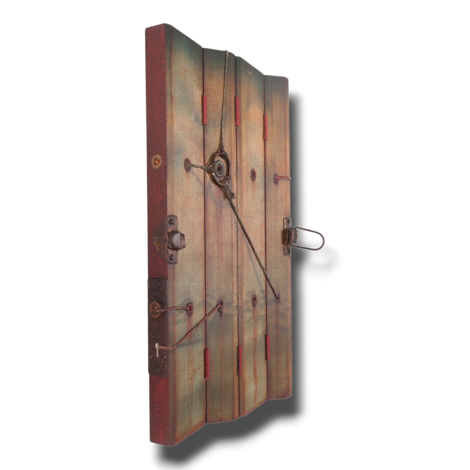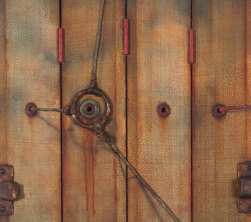 Acrylic, plaster, antique latch and other antique hardware, grommets, twine, and wood