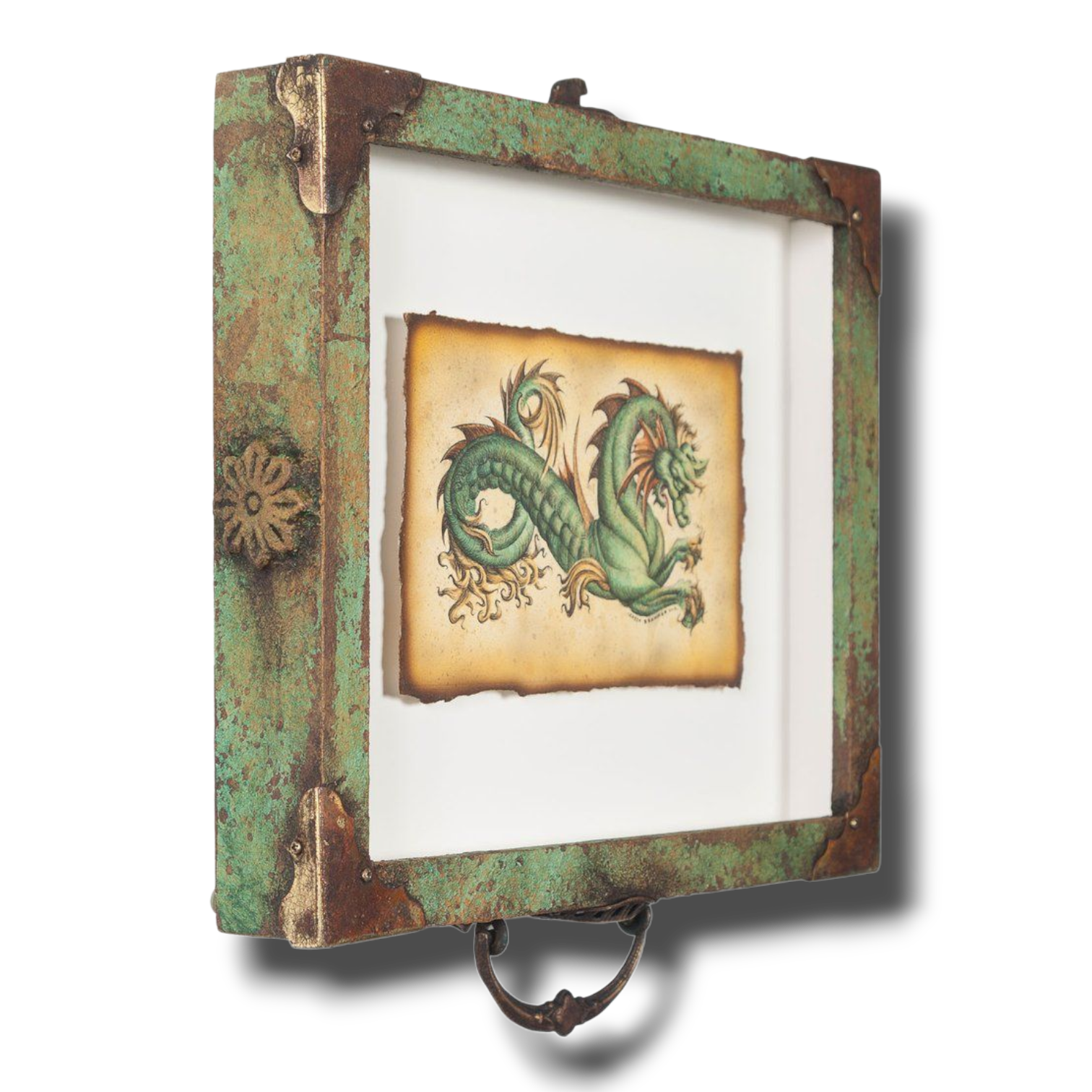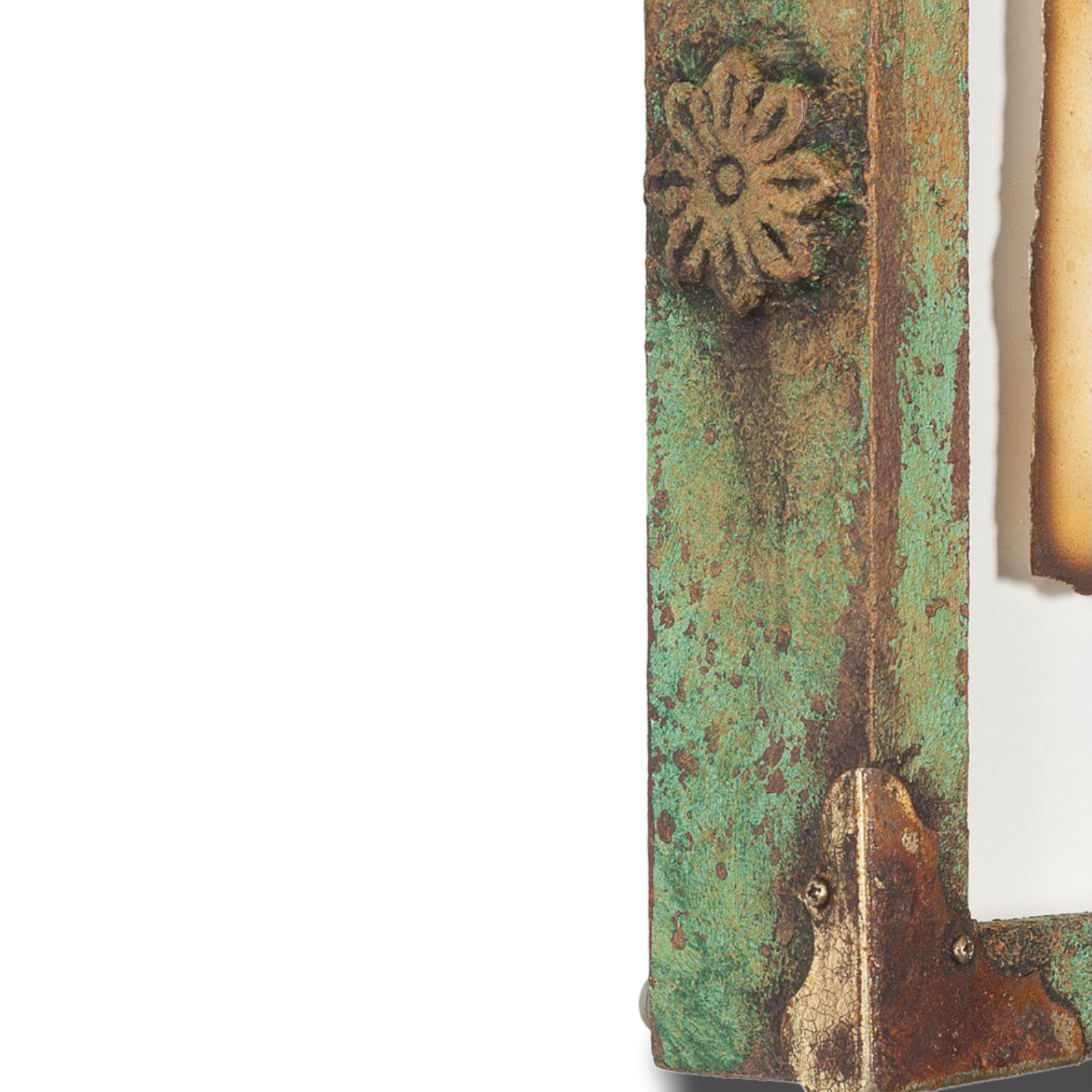 (Hand Crafted Frame : Acrylic, plaster, antique drawer pull, antique sash lock, oxidized brass corners, and wood)